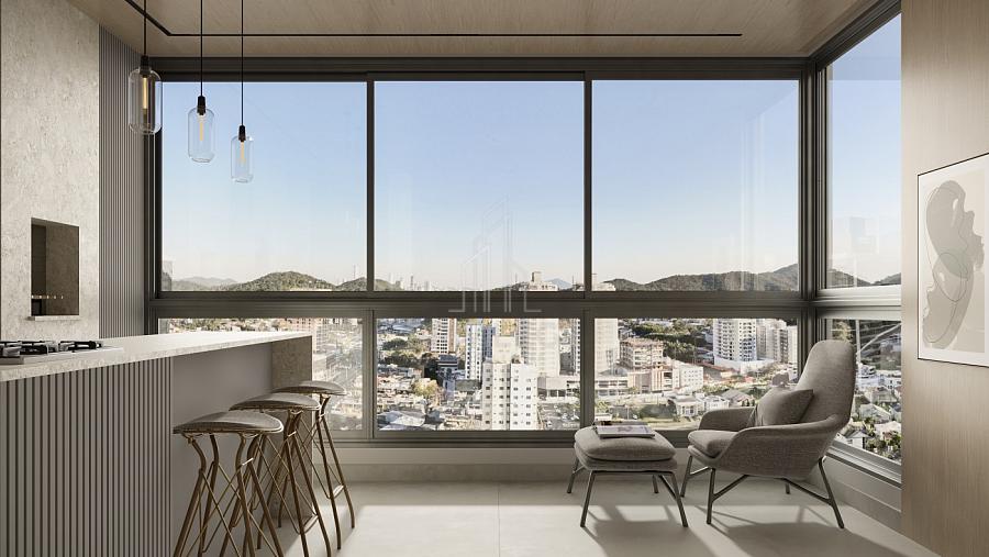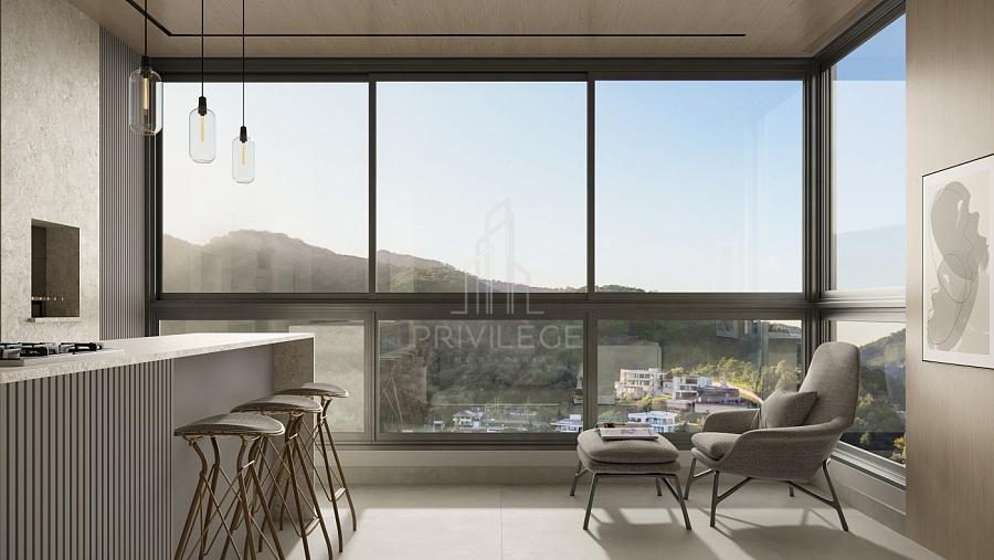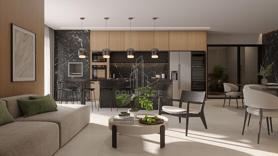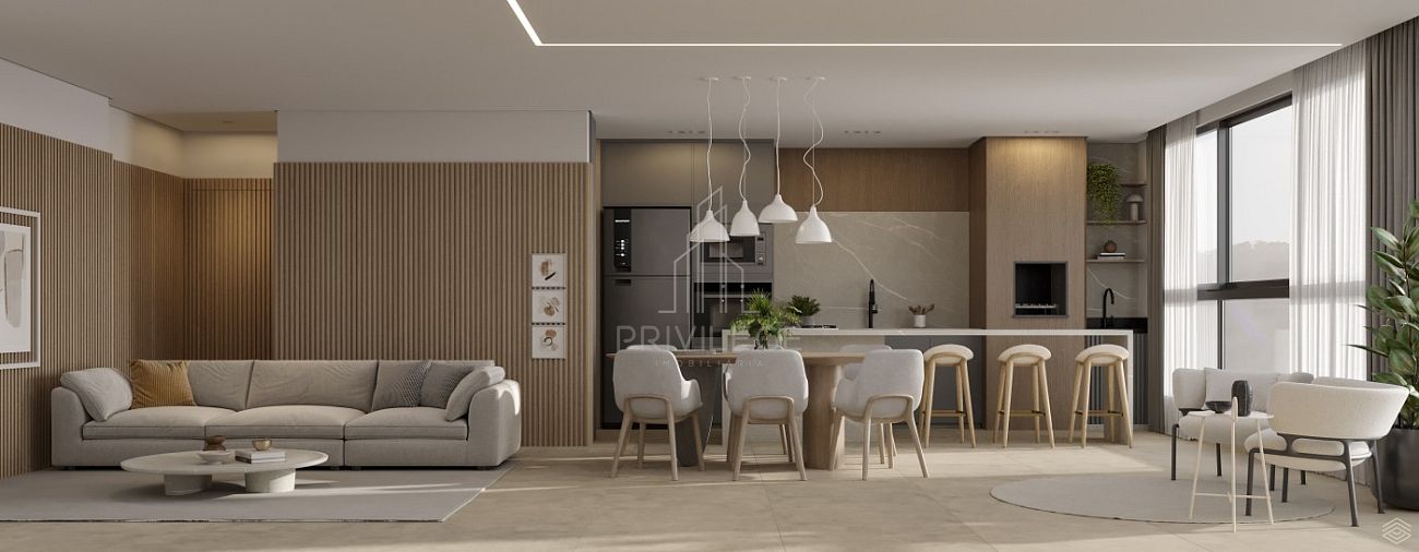 Living amplo e integrado (estar, jantar e cozinha);